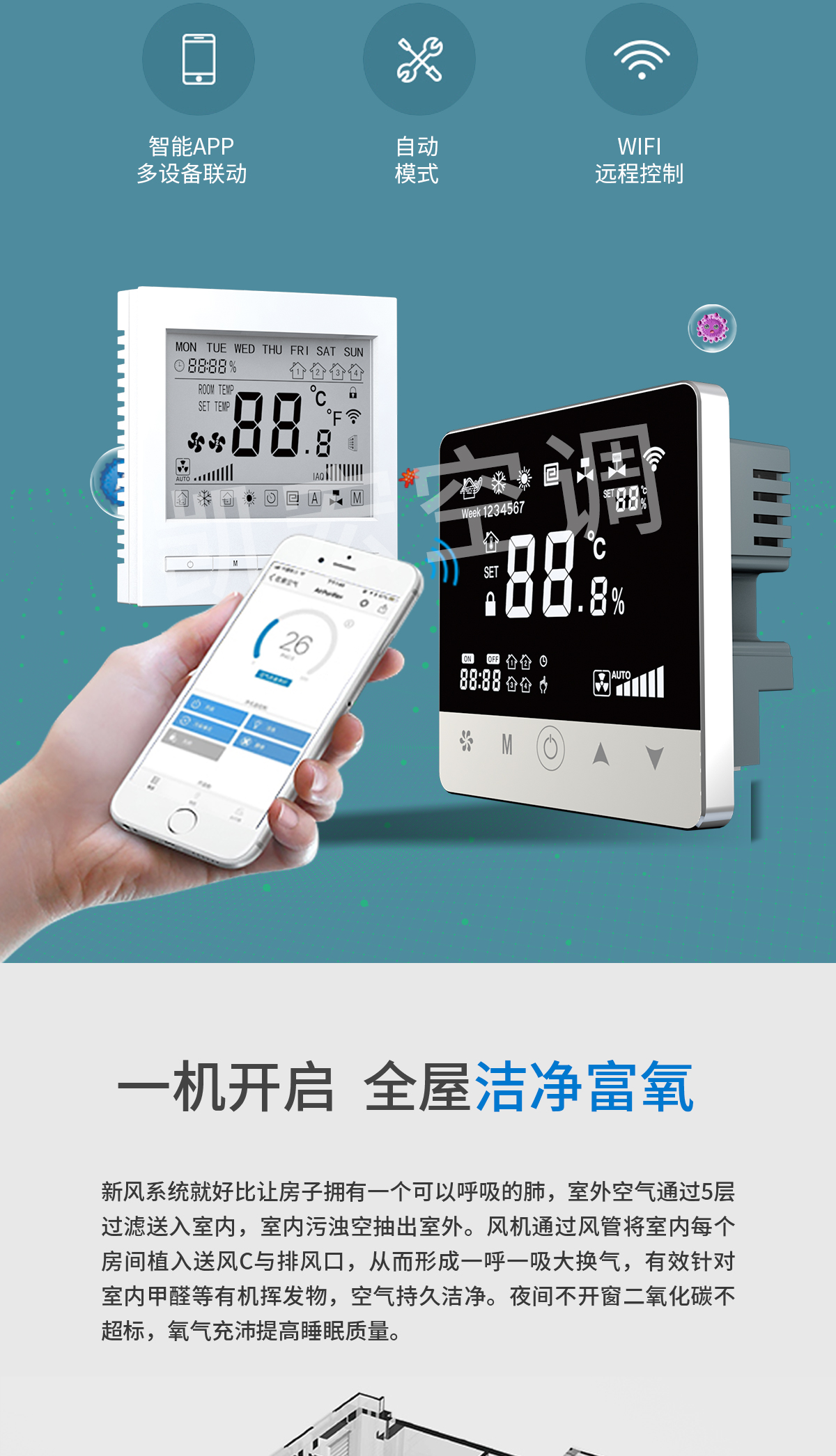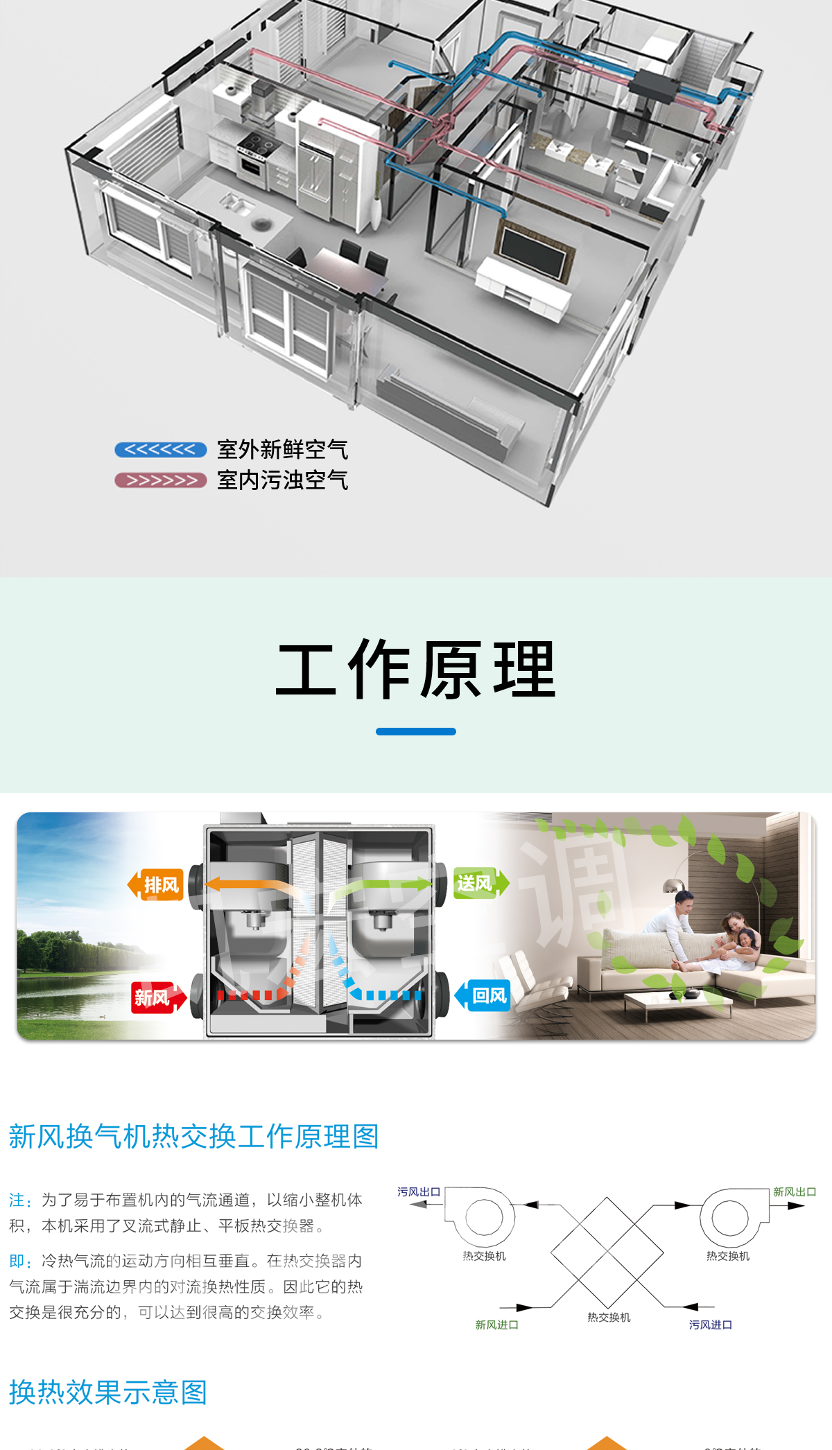雙向換氣 室內外氣體等量置換。獨特的熱交換器設計,把室內污濁空氣與室外新鮮空完全分開,防止室內外空氣交叉污染 靜音設計,安全可靠 內置低噪音外轉子離心風機,機組璧覆有新型吸聲材料,運行平穩噪音低,防止了對現場的干擾。整機除風機外無運動部件,幾乎無需維護,可確保長期穩定可靠工作 過濾凈化功能 進入室內的空氣在機組中經專業級過濾器過濾,有效防止灰塵和有害物質進入室內,保持室內空氣新鮮,同時可選用靜電凈化器、負離子發生器、光觸媒等凈化設備
