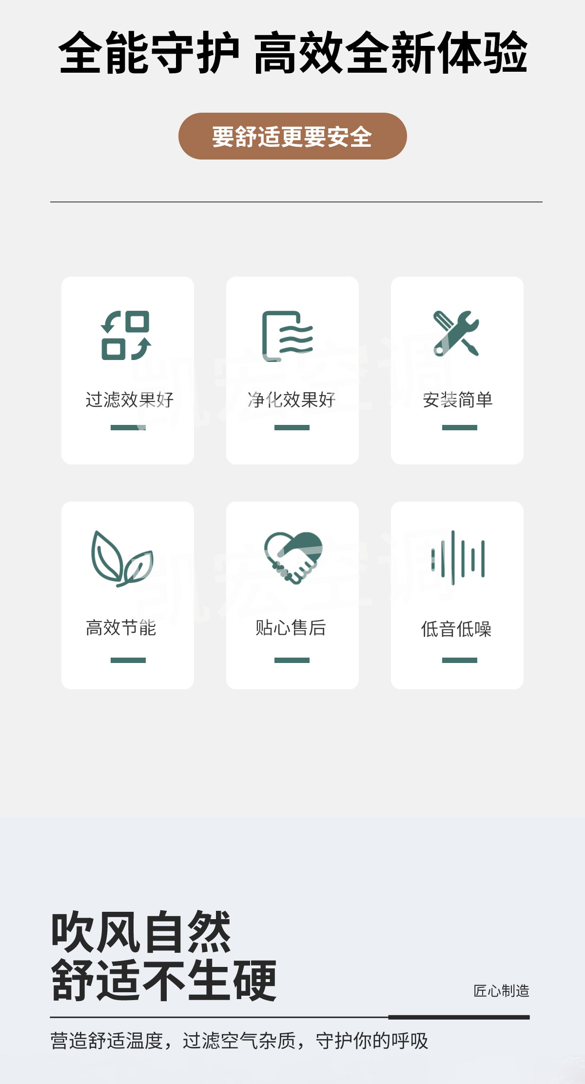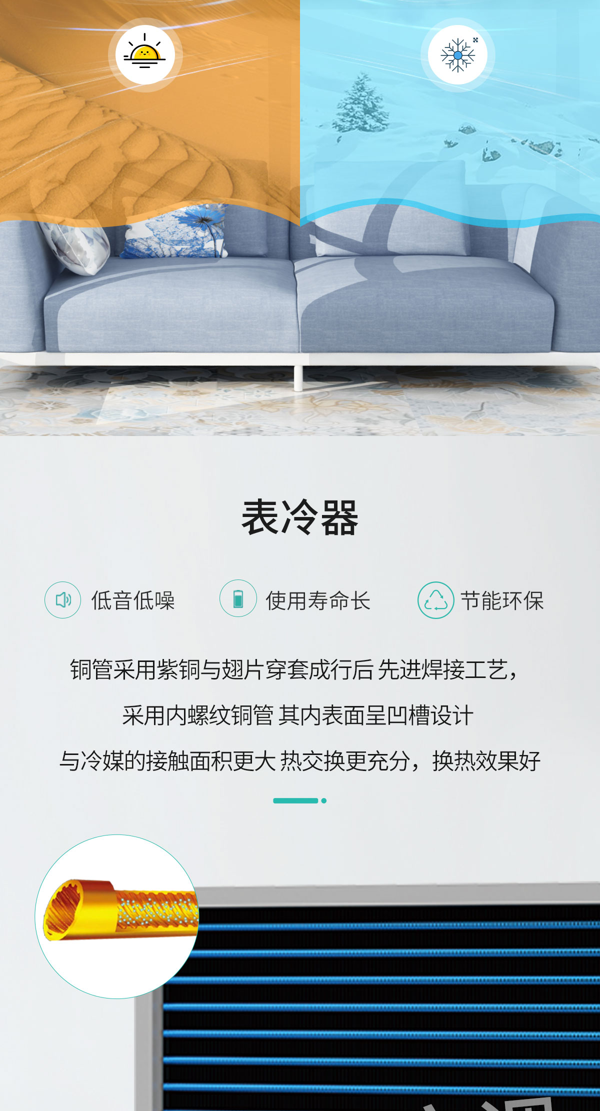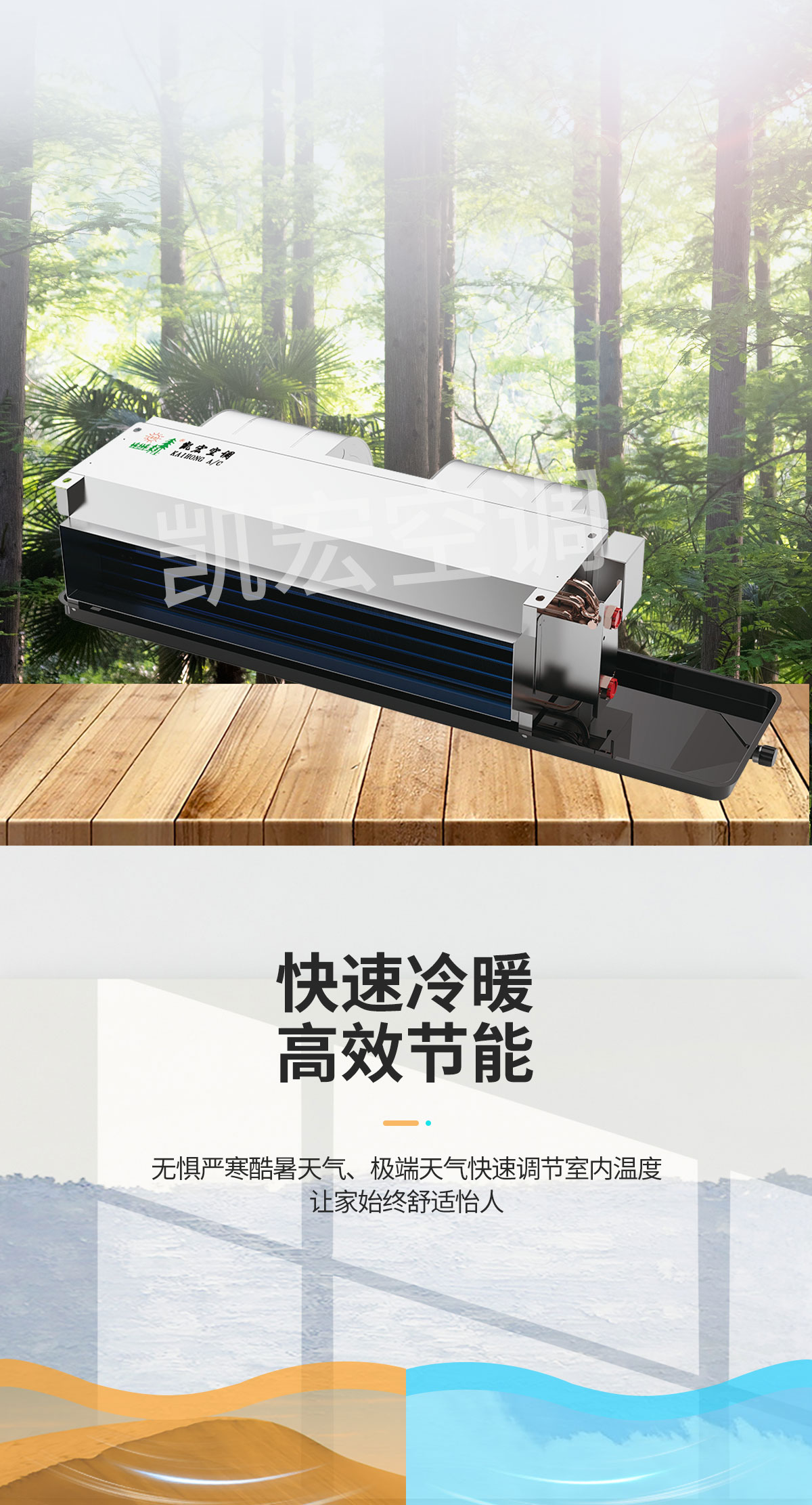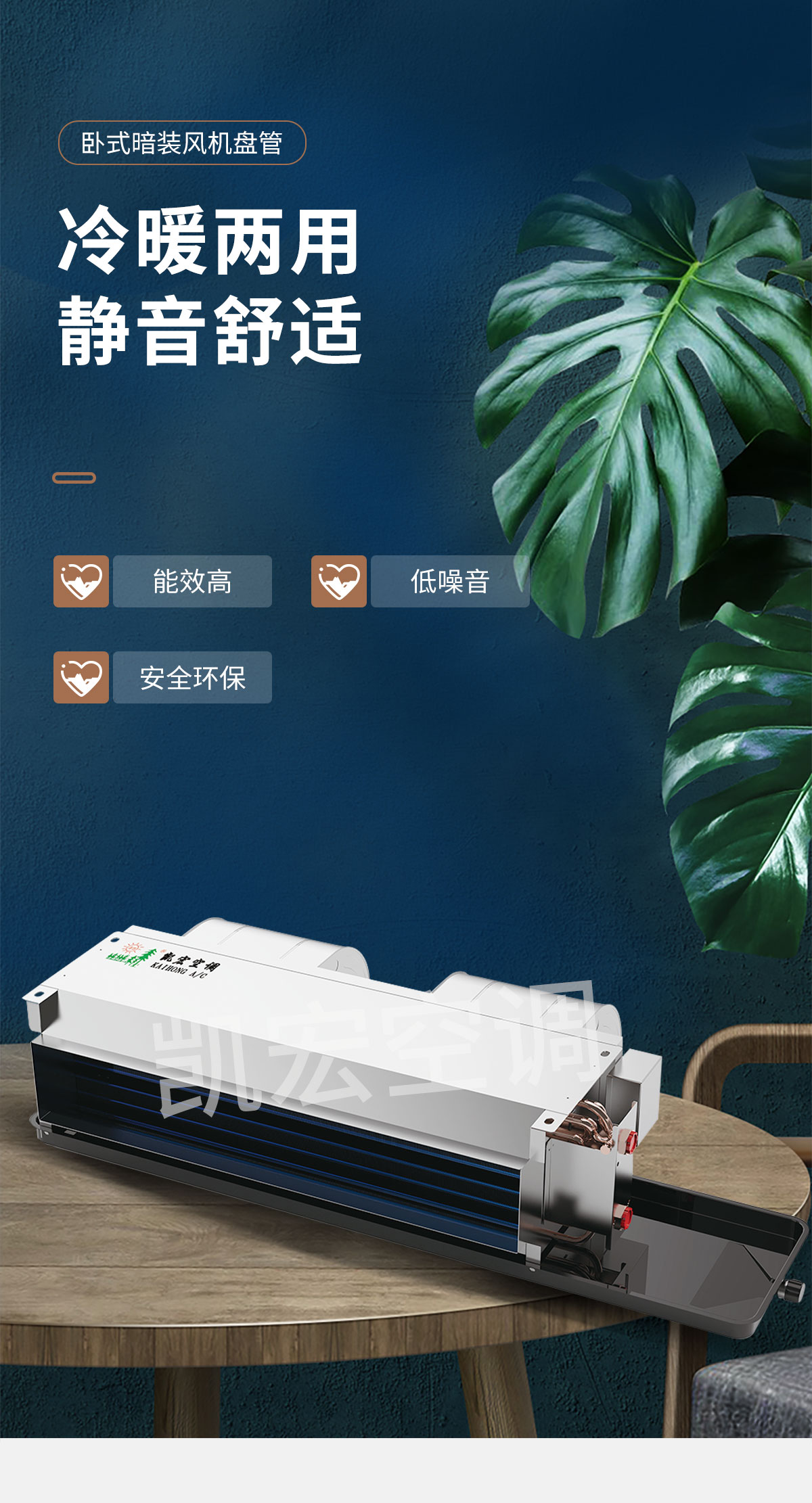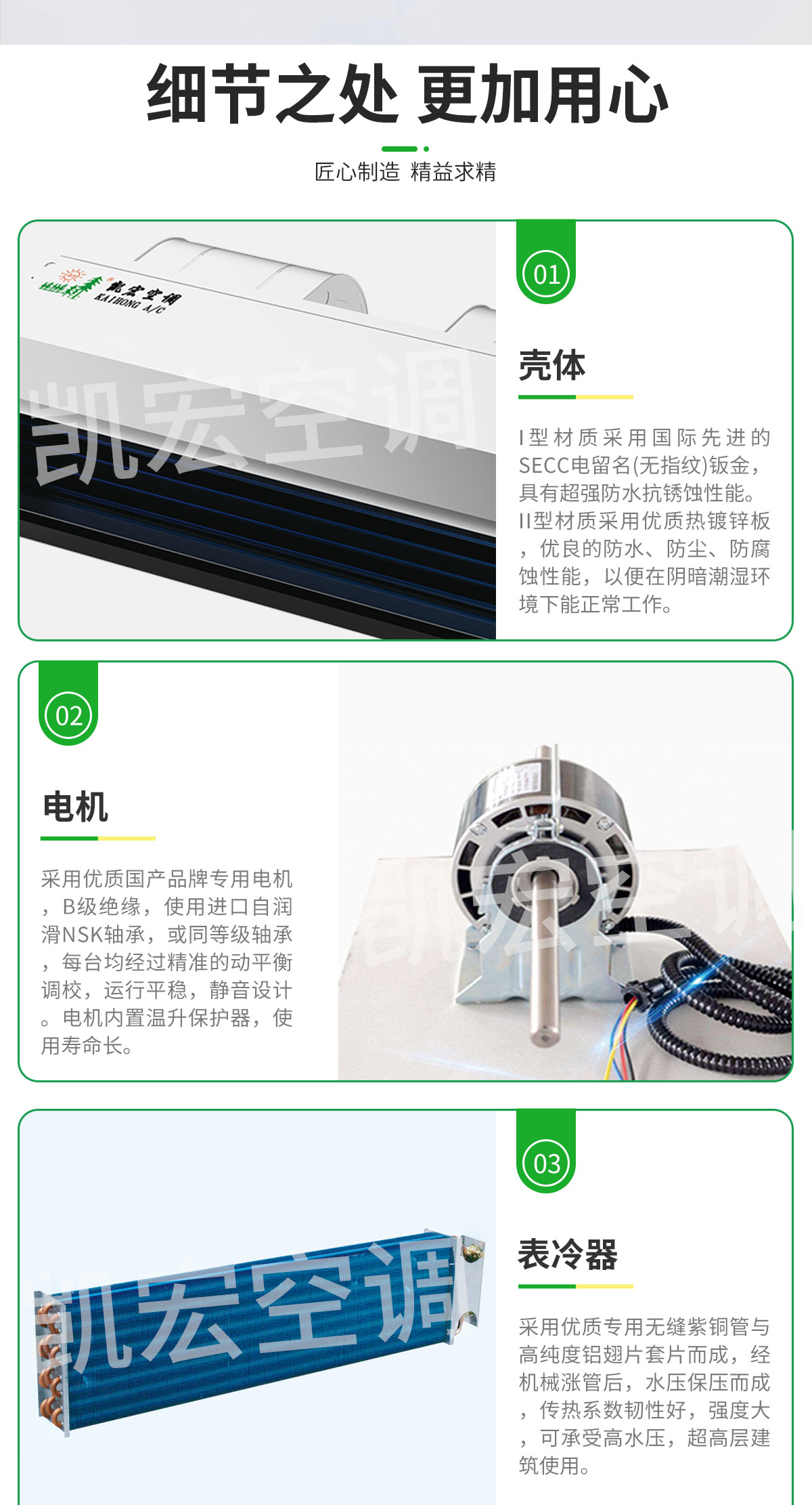 表冷器部件由臺灣弓|進的生產線制造,采用發卡式大彎管套多曲波紋雙翻邊鋁翅片,集束機械漲管,傳熱效率高,水阻、風阻 機箱采用寶鋼三期優質鍍鋅板生產。強度高、耐腐蝕性強 風機部分采用全金屬風機和優質名牌電動機及進口NSK免維護軸承,具有超低噪聲,保證機組寧靜、長久可靠地運行 凱宏卡式四出風風機盤管,采用全塑面板,外形美觀大方,徹底克服表面結露現象